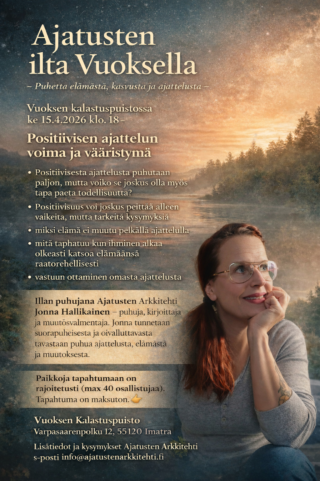 Ajatusten ilta järjestetään Vuoksen Kalastuspuistossa keskiviikkoina 15.4., 22.4. ja 29.4.2026 klo 18 alkaen. Varmista paikkasi ja ilmoittaudu mukaan! Tilaisuudet ovat maksuttomia mutta vaativat ennakkoilmoittautumisen, sillä paikkoja on rajoitetusti. Lähetä ilmoittautumisesi varauspyynnön kautta, sähköpostilla osoitteeseen [email protected] tai soittamalla meille numeroon 040 0612100.