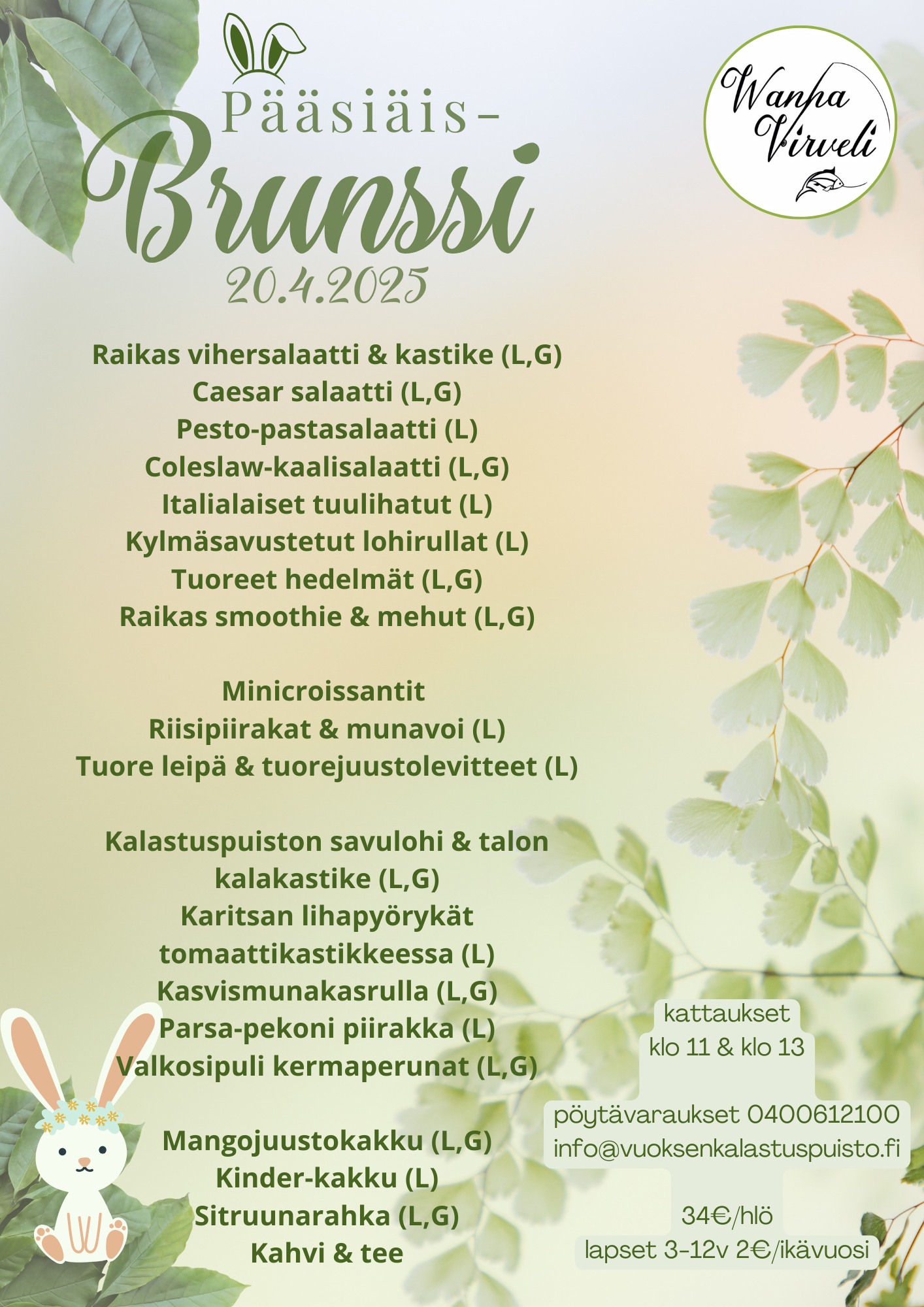 Nauti ihana vappubrunssi Vuoksen Kalastuspuiston ravintola Wanha virvelissä. Brunssi koostuu maukkaista alkupaloista, erilaisista salaateista, pääruuasta sekä jälkiruuista. Varaa pöytä 0400612100 tai info@vuoksenkalastuspuisto Tervetuloa herkuttelemaan Vappubrunssille 1.5.2025 klo 11-15 Kattaukset klo 11, 12.30 & 14 p. 0400612100 / [email protected] 34€ /hlö, lapset 3-12v 2€/ikävuosi