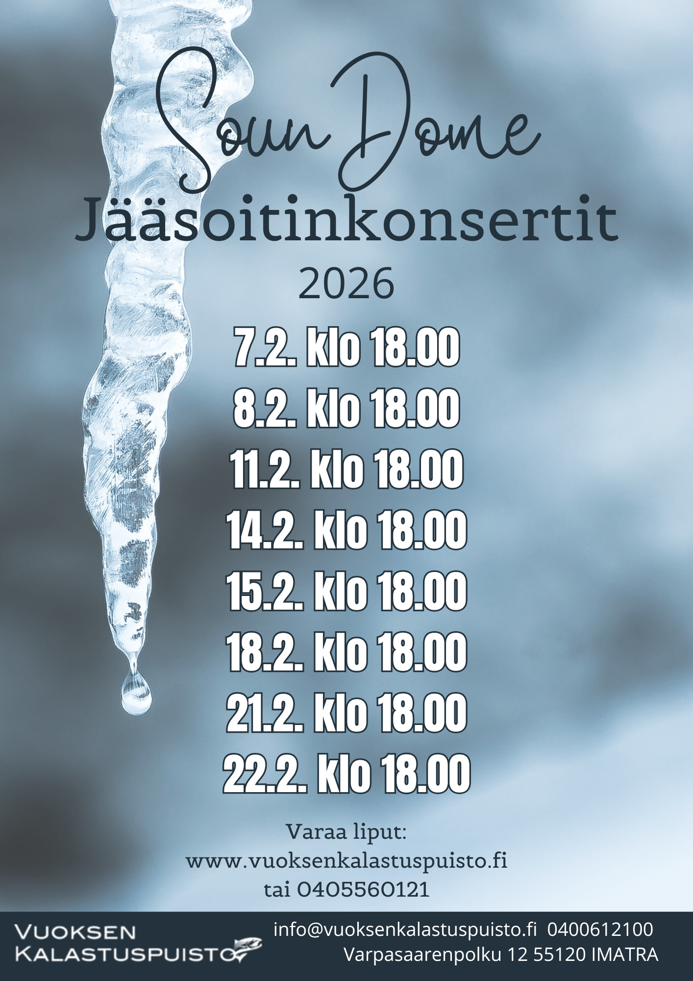 SounDome on konserttisali, joka tarjoaa uuden ja unohtumattoman musiikki- ja kulttuurielämyksen. Soittimet, joilla konsertit soitetaan ovat valmistettu jäästä, joka on nostettu Vuoksesta, suoraan tapahtuma-alueen keskeltä. Konsertissa koet ainutlaatuisen elämyksen luonnon materiaaleista valmistetuilla soittimilla ja itse konserttisalikin on jo sellaisenaan elämys. Esitykset järjestetään helmikuussa 2026 Imatralla, Vuoksen kalastuspuistossa.